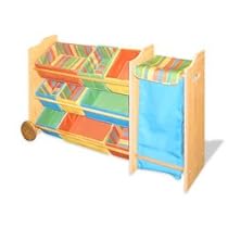 Keep play areas and kids' rooms neat and tidy with the help of this rolling organizer system. This hardwood storage organizer features fabric bins in fashion colors, plus a lift-out vinyl hamper for clothes or additional toys. Handy wheels let you move it to wherever the clutter is. Some assembly required. Measures 48" x 12" x 30". Colors and styles of fabric bins may vary.