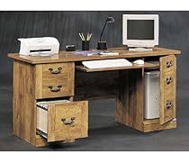 Sauder Cottage Home Collection offers a traditional twinpedestal desk, redesigned for easy computing.A slideout keyboard/mouse shelf is built in, and equipped with metal runners and safety stops.Special storage niche for a CPU hides behind a simulated drawer front with an adjustable shelf on top. CPU area is 141/8''W x 191/2''D x 253/8''H.Two file drawers with full extension slides hold letter or European size hanging files.Ships ready to assemble.